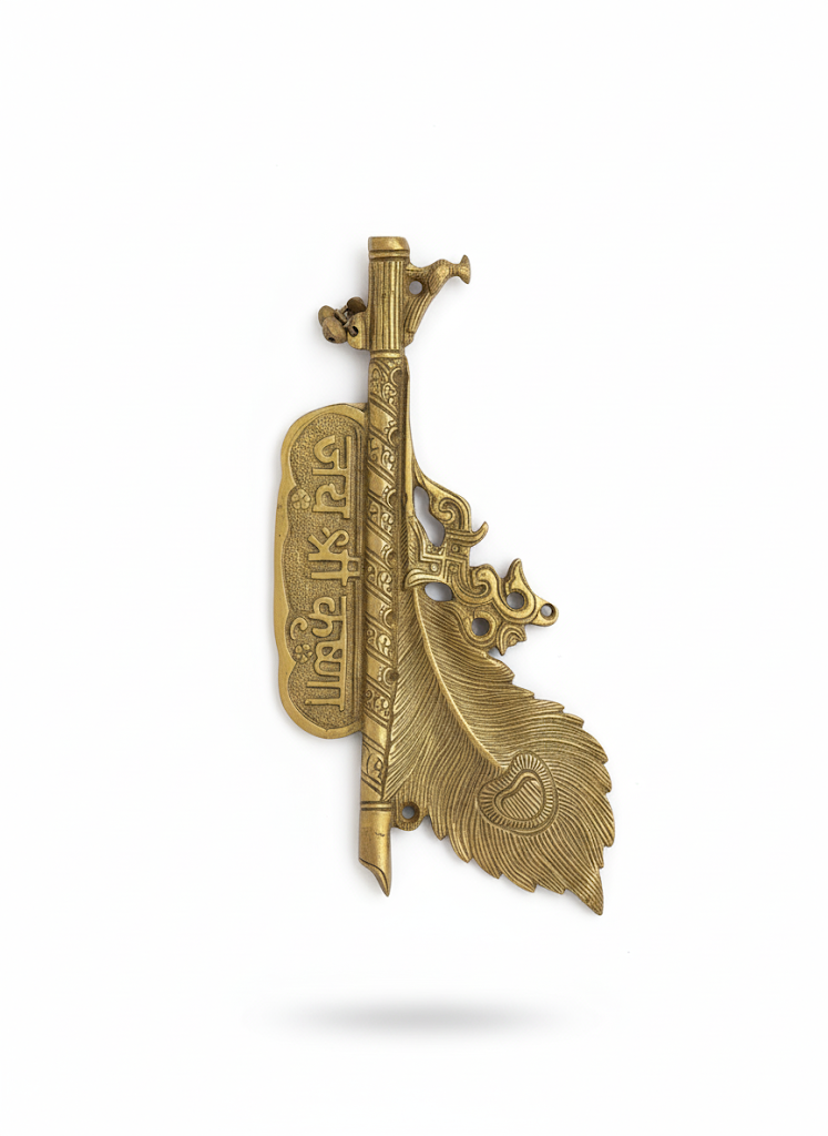 This beautifully handcrafted brass wall hanging features Lord Krishna’s flute paired with an intricately detailed peacock feather, symbolizing divine love, harmony, and positivity. Accented with the sacred inscription “Jai Shri Krishna,” it is ideal for pooja rooms, entrances, or spiritual décor, adding a timeless devotional charm to your space.