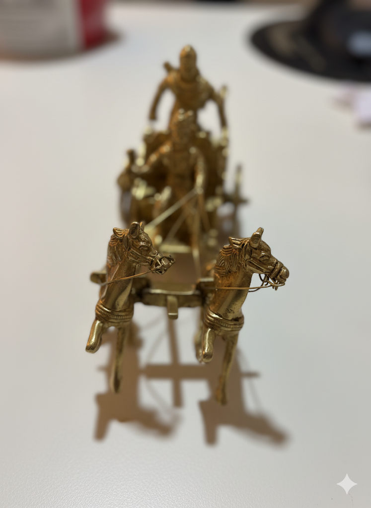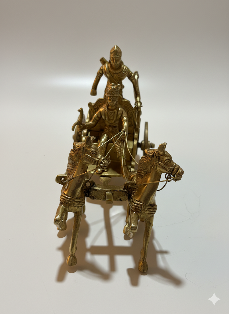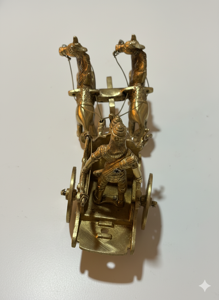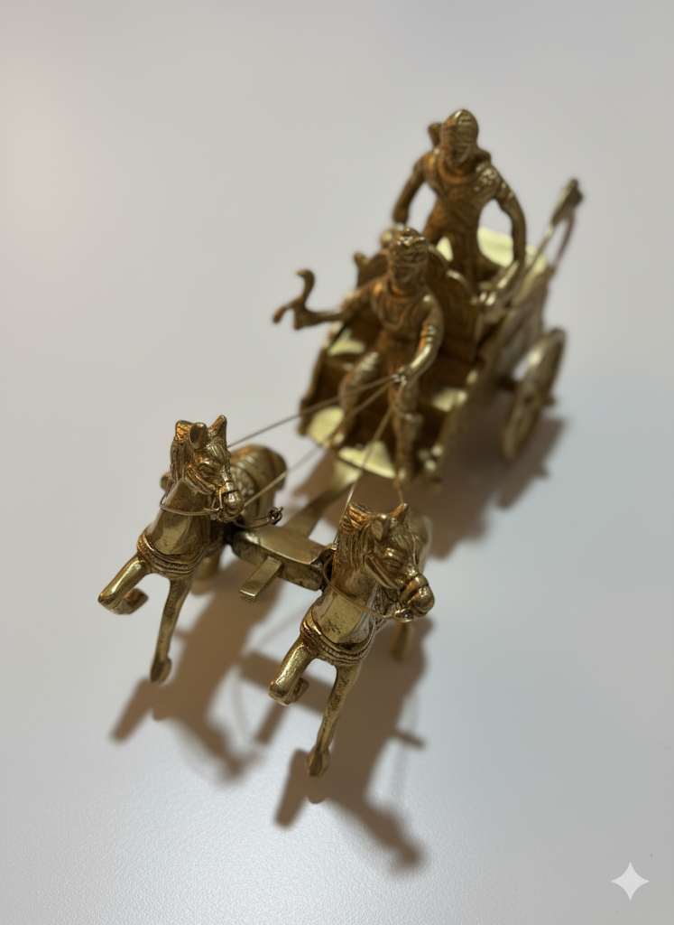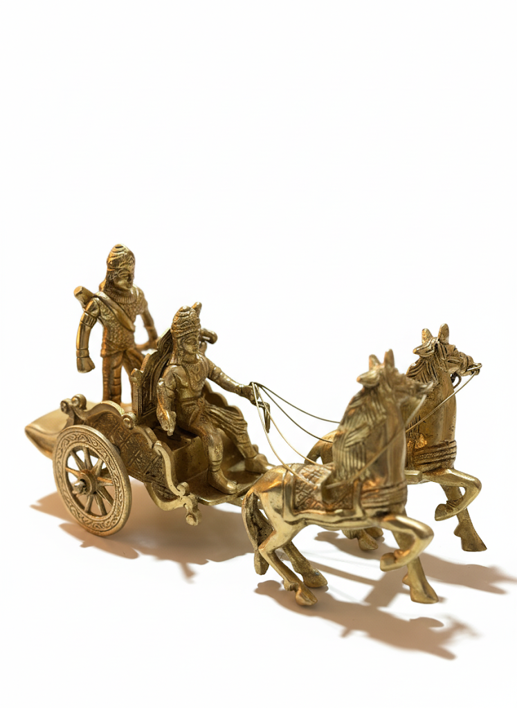 A finely detailed brass chariot featuring two galloping horses and traditional warrior figures, crafted with intricate detailing. This elegant showpiece reflects India’s rich heritage and makes a striking décor accent for living rooms, offices, or as a collectible gift.