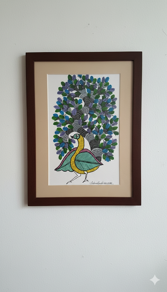 The intricate scale patterns on the peacock’s wings and the fine-line work on the tree branches showcase superior tribal craftsmanship.