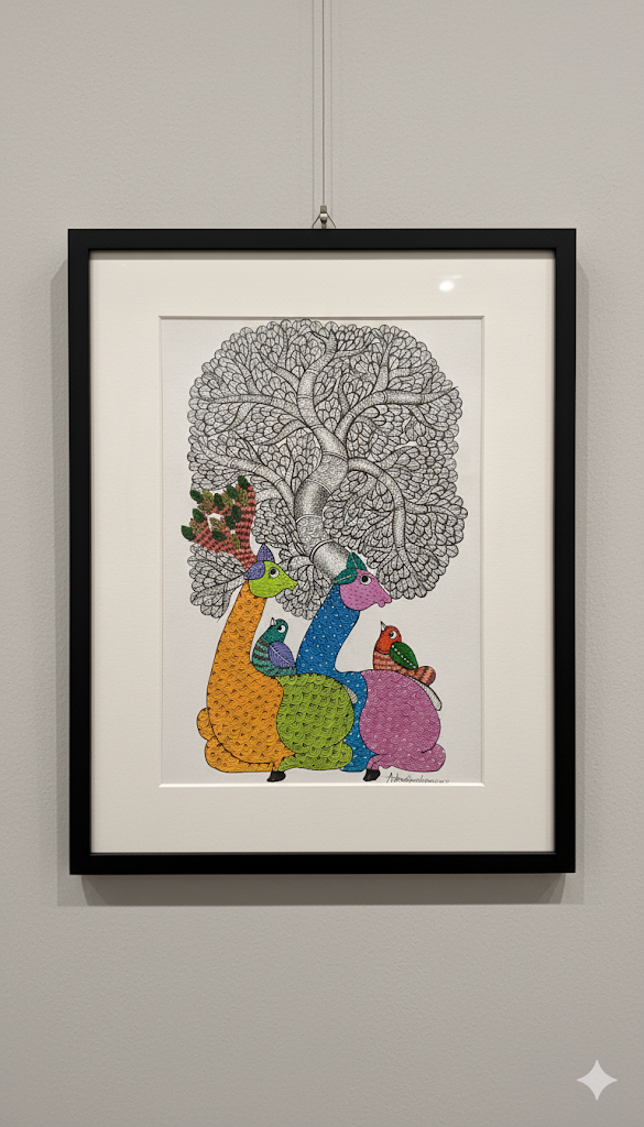 This piece beautifully illustrates the tribal belief that the forest provides a safe and sacred shelter for all beings.