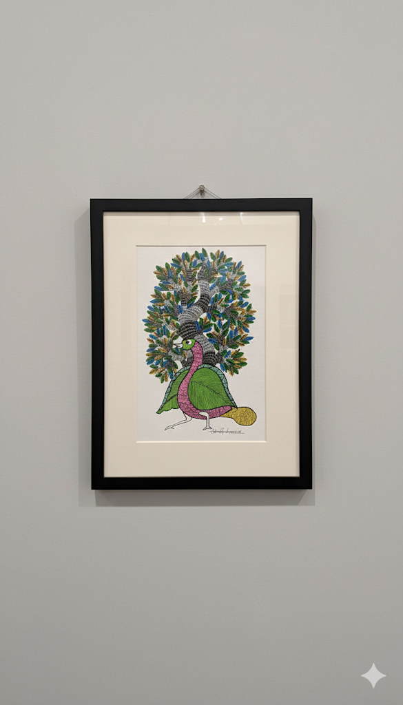 This elegant piece features a proud peacock rendered in a sophisticated palette of emerald green and soft rose.