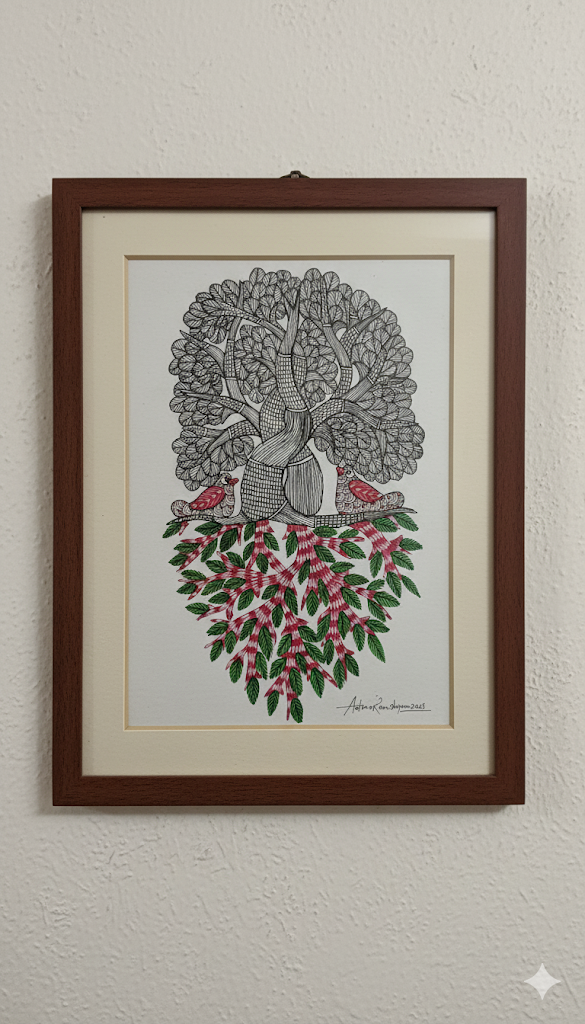 This rare Gond composition features a dual-natured tree with an intricate monochromatic canopy and vibrant, red-patterned roots.