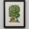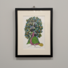 This unique artwork portrays a stylized, mythical bovine creature resting beneath the spiraling boughs of a sacred tree.