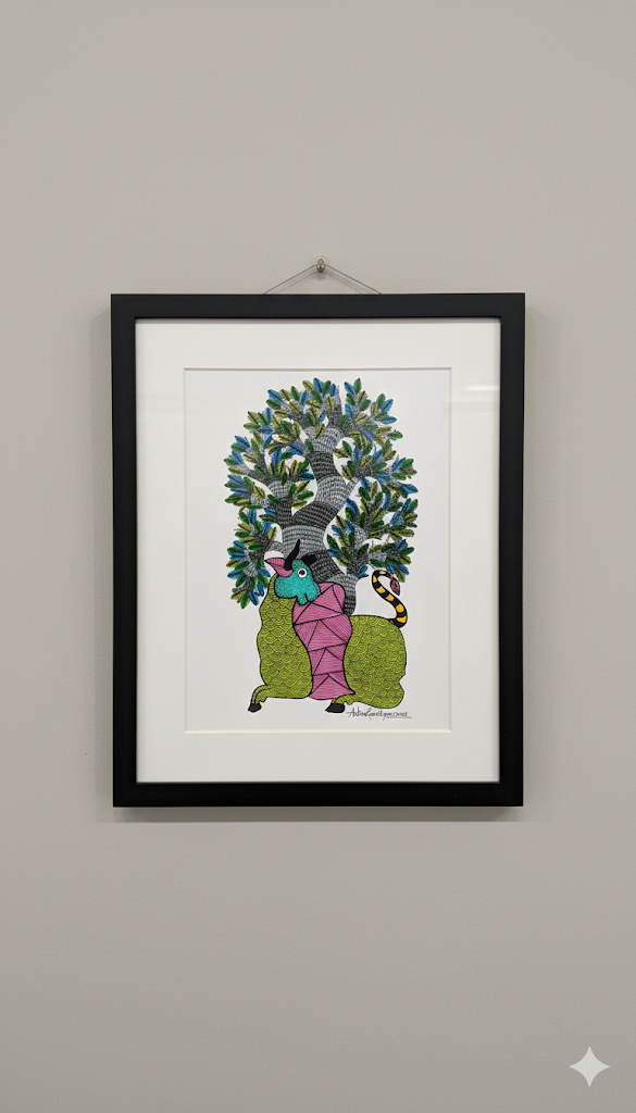 The creature features a vibrant green coat and a striking pink-patterned saddle area, adorned with signature Gond dot work.