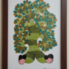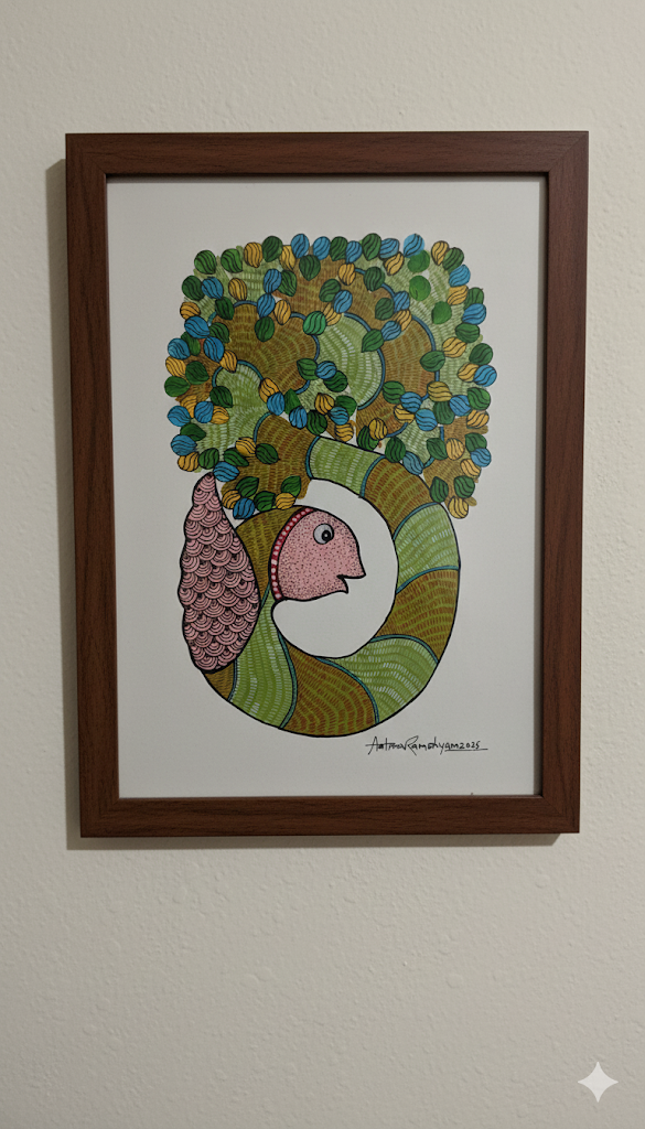 This striking Gond composition features a spirit fish with a soft pink head, its body spiraling upward into a lush tree canopy.