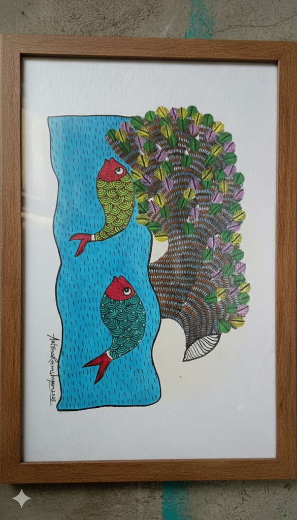 Every form is meticulously filled with signature Gond patterns, creating a sense of internal life and constant motion.
