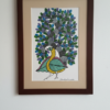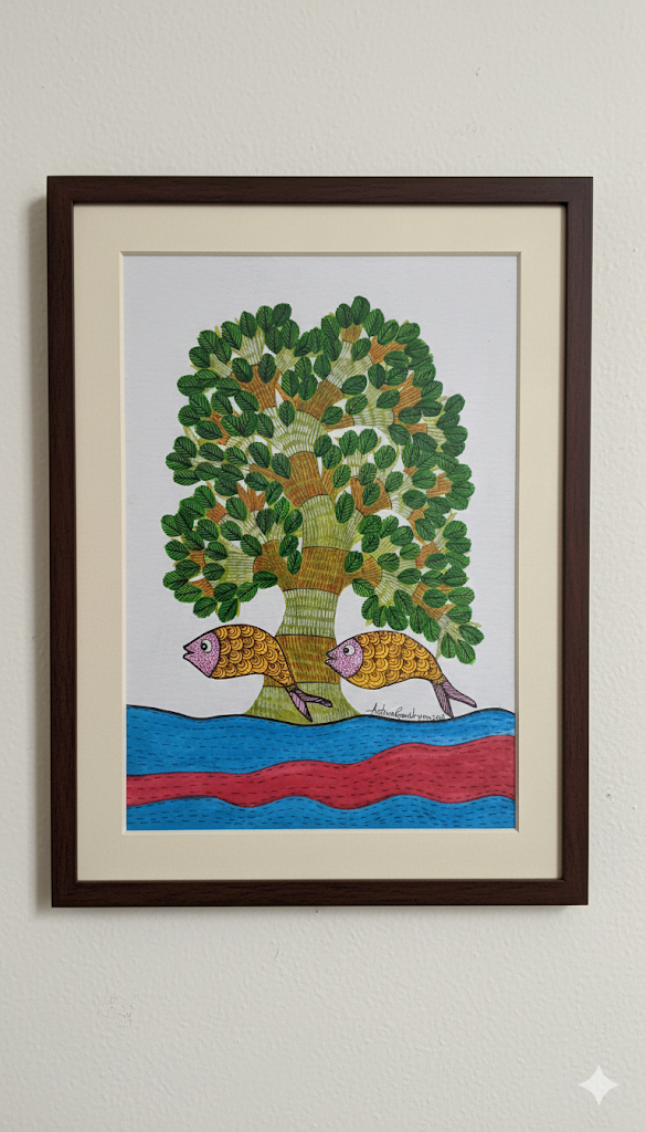 This striking composition features two golden fish swimming in a vibrant, multi-layered stream at the base of a green sacred tree.