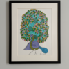 The tree’s grey, textured trunk provides a sophisticated base for the vibrant greens and blues of the foliage and wildlife.